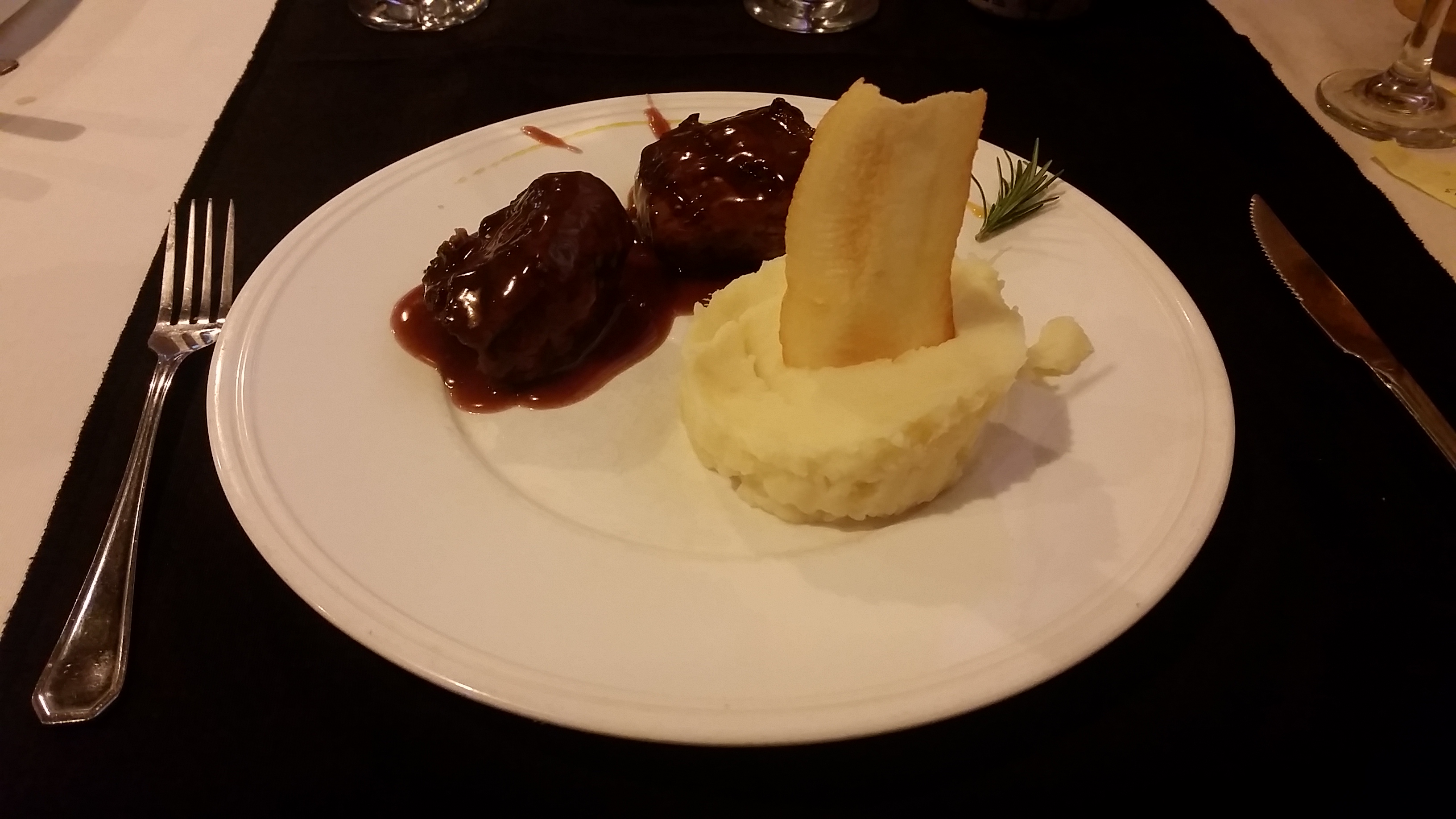 Eu e minha mãe fomos de filé mignon ao molho de Malbec com purê de batata trufado (que não tinha nada de trufado, mas estava bem gostoso). A carne, para mim, estava um pouco bem passada demais, mas muito macia e gostosa, mas ainda sim, preferi o chorizo.