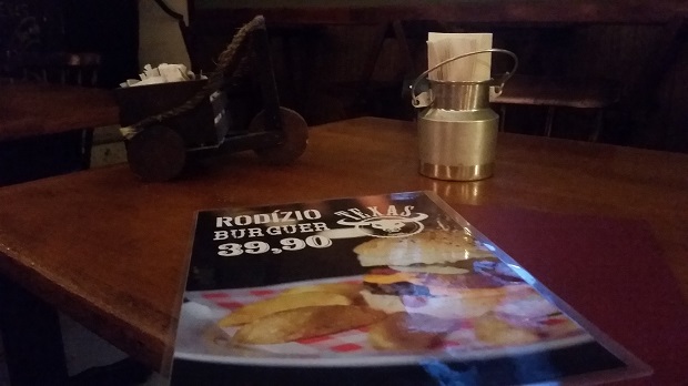 Confesso que fui ao Texas por causa do bolso – eles têm convênio com o Chef’s Club e terça é dia deles. Assim que parei o carro, achei o ambiente meio estranho. Muitos motoboys na porta e um som meio nada a ver tocando na maior altura não dava certeza se eu realmente estava no lugar certo. Entrei e me sentei. O salão é pequenininho, com apenas quatro mesas. Não sei bem o porquê, mas para mim, tudo estava com cara de engurdurado, sabe? Do chão às paredes de madeira – a decoração é toda inspirada no Texas. A única coisa que destoa do clima é a televisão, que estava passando um filme no volume máximo.